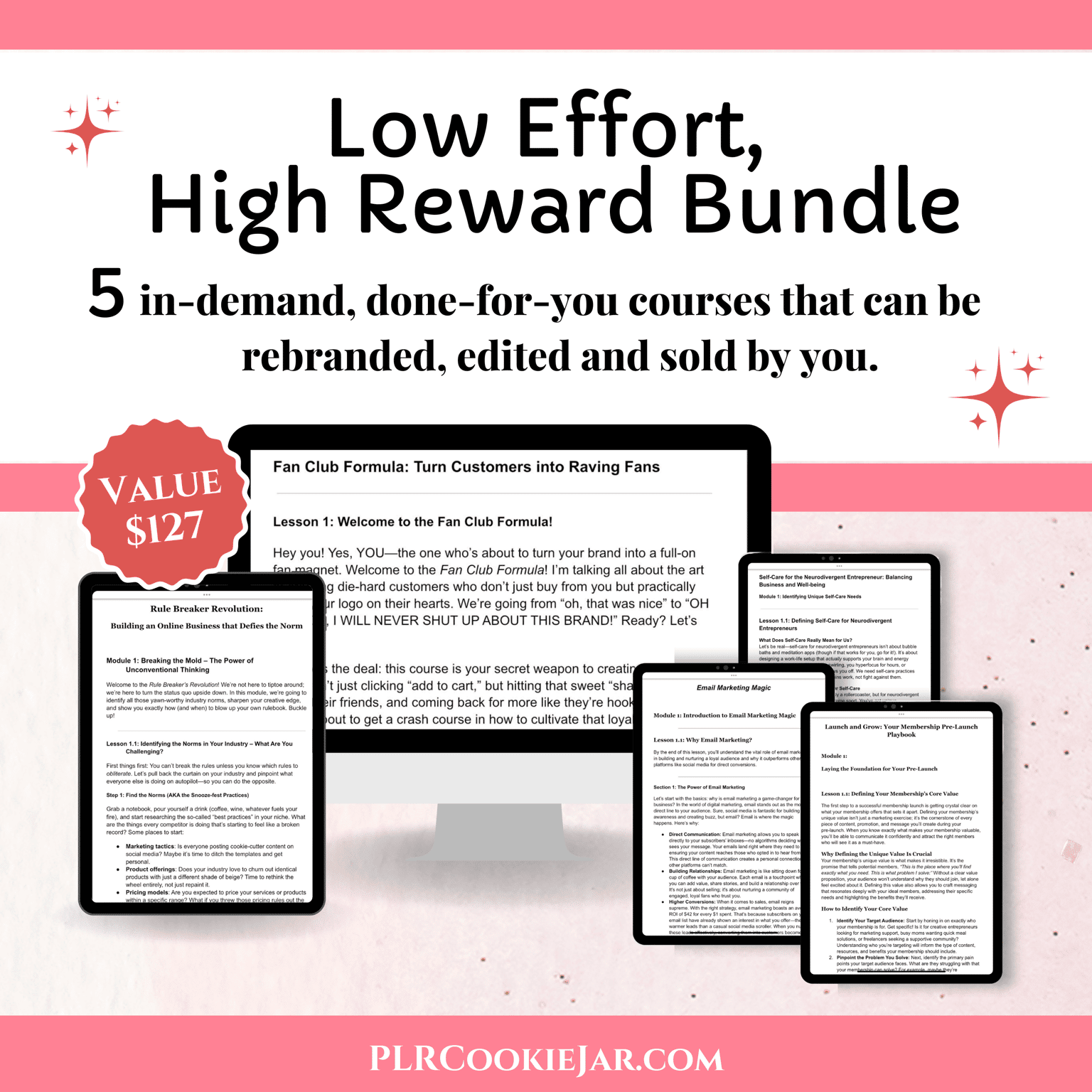 Hey, you fellow magnificent procrastinator. This is it Reader. The moment where we lock eyes across the digital abyss, and I remind you that you’ve got exactly 4 hours to snag the Low Effort, High Reward Plug-n-Play Bundle, before the price jumps from “holy cow, only $67?!” to “why didn’t I buy it at $67?!” Let’s talk about what’s on the table: ✨ Rule Breaker Revolution - 8 Modules of 10,789 Words in Google Doc Format – For when you’re done playing small and ready to shake up your industry. 📬 Email Marketing Magic - 10 Modules, of 11,751 Words in Google Doc Format – Your ticket to turning email subscribers into die-hard fans with every send. 🌈 Self-Care for the Neurodivergent Entrepreneur - 7 modules of 8,783 Words in Google Doc Format – Because burnout is so last season. 🚀 Launch and Grow Membership Playbook - 7 Modules, of 7,636 Words in Google Doc Format – Make your next membership launch feel like a blockbuster opening weekend. 🔥 Fan Club Formula - 8 Modules, of 10,535 words in Google Doc format – Create the kind of loyalty that turns your customers into your personal PR team. Oh, and did I mention these come with full length sales page copy included? It’s like handing you an easy pass. AND they come with Master Resell Rights so you can use them, sell them, prettify them, or just roll around in your newfound empire-building genius. In 4 hours, this bundle goes from $67 to $127. That’s a 90% price increase. Okay, fine, it’s not really, but it’s close enough to make you cringe when you realize you missed out. 👉 Click here to snag it now for $67. You won’t regret it. This is your moment. Don’t let the door close on this deal while you’re still sitting there deciding between Netflix or Hulu. Just get the bundle and thank yourself tomorrow when your business has 5 ready-to-sell courses waiting to make you money. 🙌 Tick tock, P.S. After 4 hours, this price is GONE. No extensions, no “sliding in the secret back door” emails — this is your sign. Go now. Click here to grab it. P.S: Want to see more from the PLR Cookie Jar? Check out all our templates in our shop HERE You can always access your account here: Login URL: https://plrcookiejar.thrivecart.com/signin/ Want to fill your Cookie Jar with CASH?!